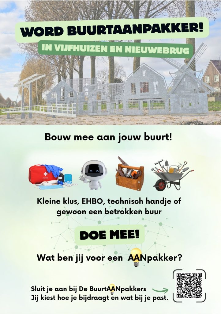 Daarom steunen wij het initiatief De BuurtAANpakkers van Vereniging Dorp Vijfhuizen. Dit is een netwerk van bewoners die elkaar helpen in de buurt. Iedereen kan meedoen en bijdragen op een manier die bij hem of haar past.
